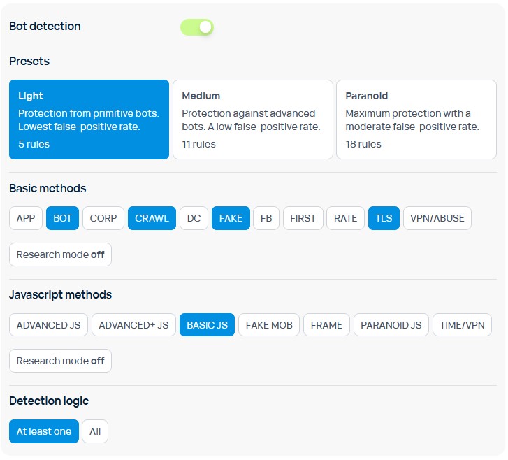 Research mode - The tracker will check all incoming traffic in this campaign against all Basic methods, even if those methods are not enabled in the Basic methods block. This data will be used in reports, but clicks will not be marked as bots based on these checks.
