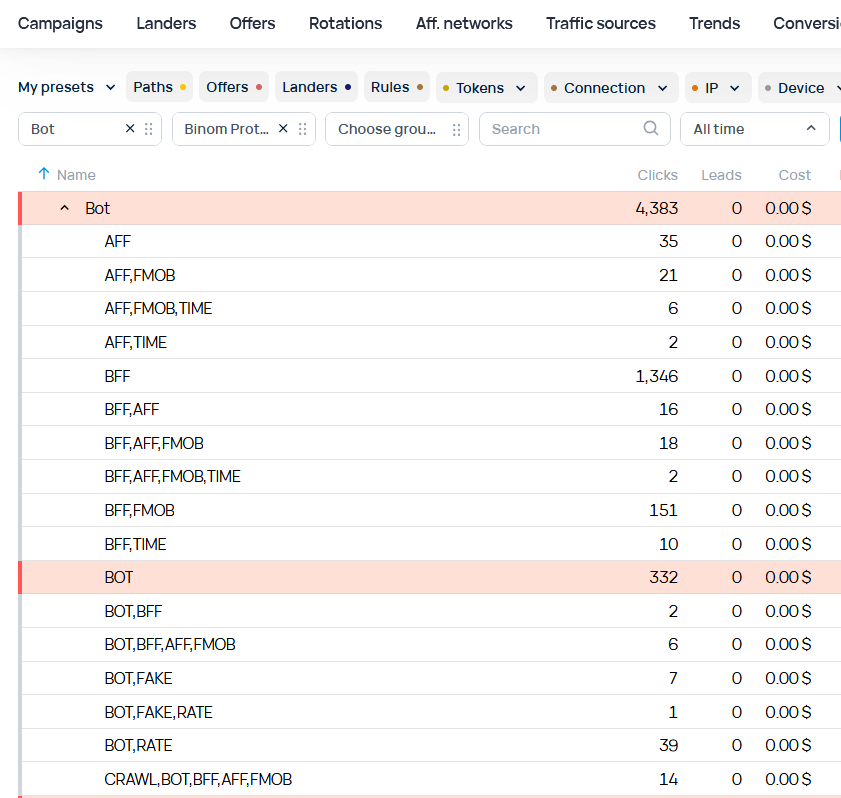 Campaign reports and the Clicklog tab will provide you with info about the functioning of Binom Protection (Beta).