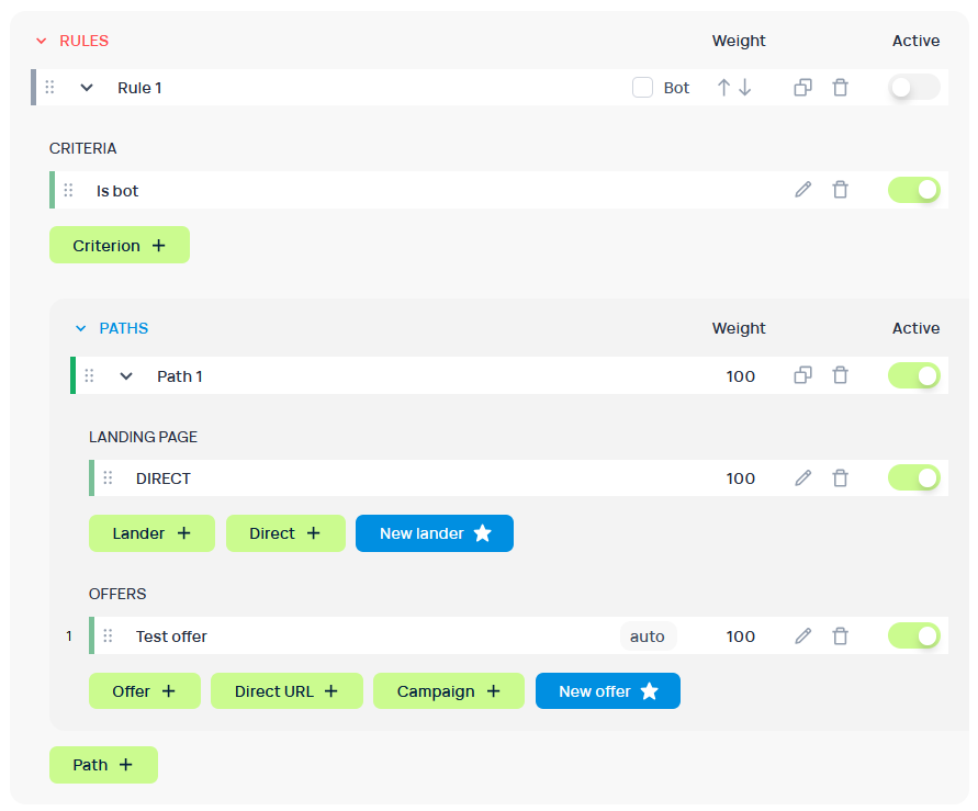 Binom Protect will mark the traffic as bot based on the selected tags. You need to create a Bot rule to send the clicks to a specific bot Path.