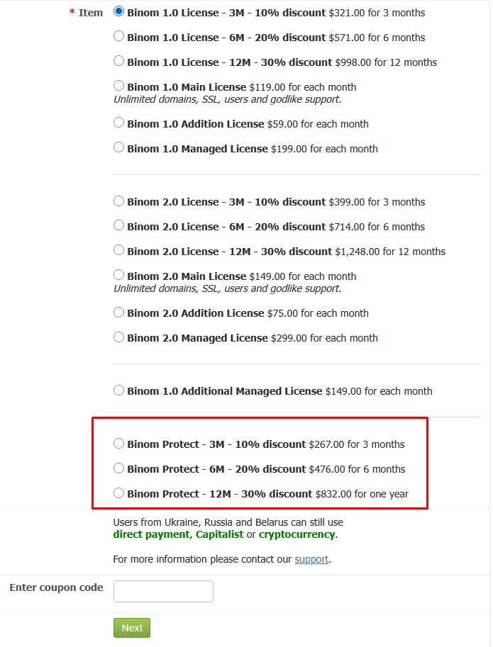 Choose the Binom Protect license type and the amount of days you want to get it for.
