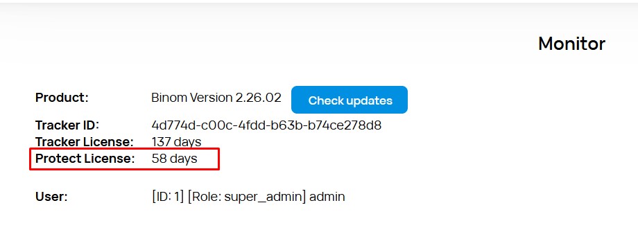 You can see the remaining Binom Protect license days on the Monitor tab in your tracker.