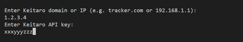 Follow the prompts and paste in the IP of the server where you have the Keitaro tracker and the API with access to Keitaro Admin API.