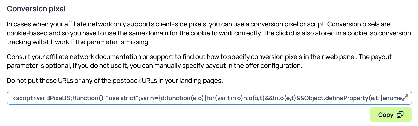 Sometimes affiliate networks don't support the regular Postback URL and use Conversion Pixel instead (Postback Pixel, Tracking Pixel). Usually they are used when a conversion happens on a landing page.